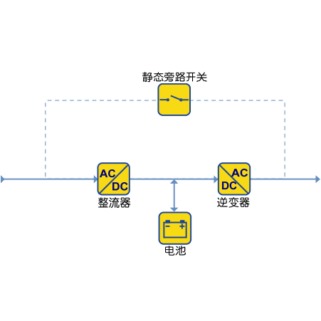 ? ??這是10KVA以上功率范圍的電源最常用的UPS類型。在雙轉(zhuǎn)換在線式UPS的結(jié)構(gòu)圖中,除了主電源路徑是逆變器(而非交流主電源)外,其余與后備式設(shè)計相同。
