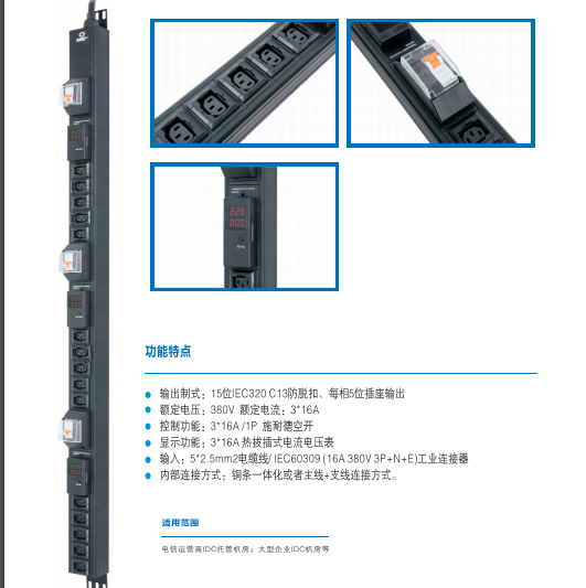 ●輸出制式: 15位IEC320 C13防脫扣、每相5位插座輸出●額定電壓: 380V額定電流: 3*16A●控制功能: 3*16A/1P施耐德空開